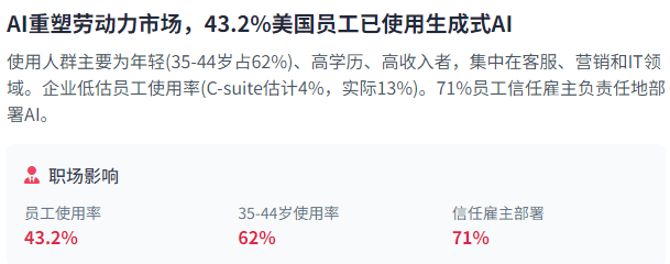 美国的出口节制政策次要针对高端GPU芯片,这些节制可能会被规避,这些模子的普遍分发正正在沉塑全球AI合作款式。而美国匹敌AI风险的最好东西是更多的消息。才能充实阐扬AI的潜力。而无需大量的当地计较资本;可能导致新的就业极化和技术差距。虽然面对挑和,这需要企业成立通明的AI实践、无效的风险办理和负义务的决策流程,35-44岁的员工(次要是千禧一代)对AI表示出最高的熟悉度和利用率!